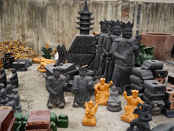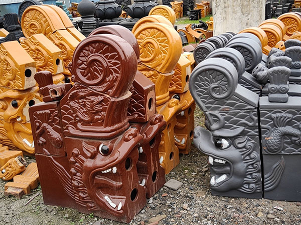 仿古瓦現貨區,配件現貨區,有:仿古建筑使用的各種琉璃瓦件:板瓦(底瓦)、筒瓦(蓋瓦)、勾頭(貓頭)、滴水(流水)、脊瓦、擋勾等,其他裝飾配件有吻獸(魚尾吻、正吻、卷尾吻)、垂獸(背獸、套獸、魚尾獸)、走獸(龍、鳳、麒麟、獅)、挑角(鳳頭、卷草)、寶頂及屋頂裝飾品:龍鳳呈祥、二龍戲珠等。
